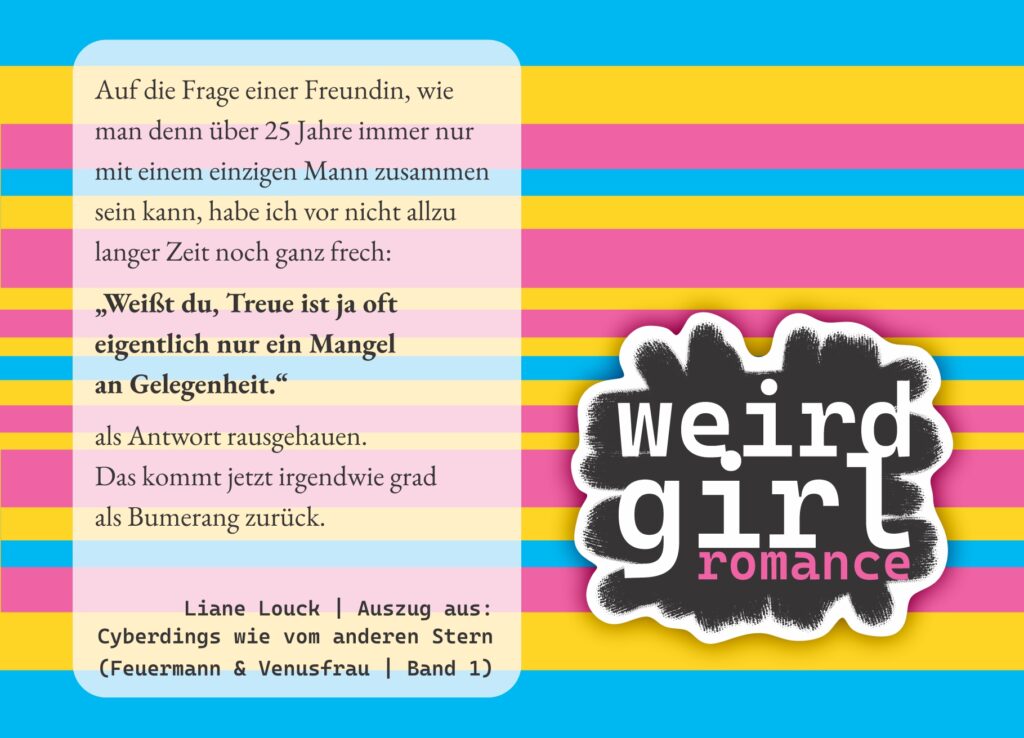 Eine kleine „Warnung“ vorab: Leeloo, Alter Ego der Autorin und Ich-Erzählerin, durchbricht gelegentlich die vierte Wand und spricht die Leser*innen direkt an. Davon abgesehen flucht sie oft, manchmal sogar auf Französisch, wirft mit Denglisch nur so um sich, raucht, trinkt vermutlich zu viel Elbling und isst gerne, egal ob Thaifood oder Lebkuchen. Trotz allem ist sie eine geradezu schrecklich romantische Person die, obwohl schon hart am Rande der Wechseljahre, unbeirrt an die Liebe auf den ersten Bli… äh, Chat glaubt. Na ja und an Horoskope. Sicher ganz gut, dass die Stimme ihres sarkastisches „Gewissens“ sich gerade jetzt dazu entschieden hat, in ihrem Kopf aufzutauchen und Leeloo hin und wieder ein wenig einzunorden.