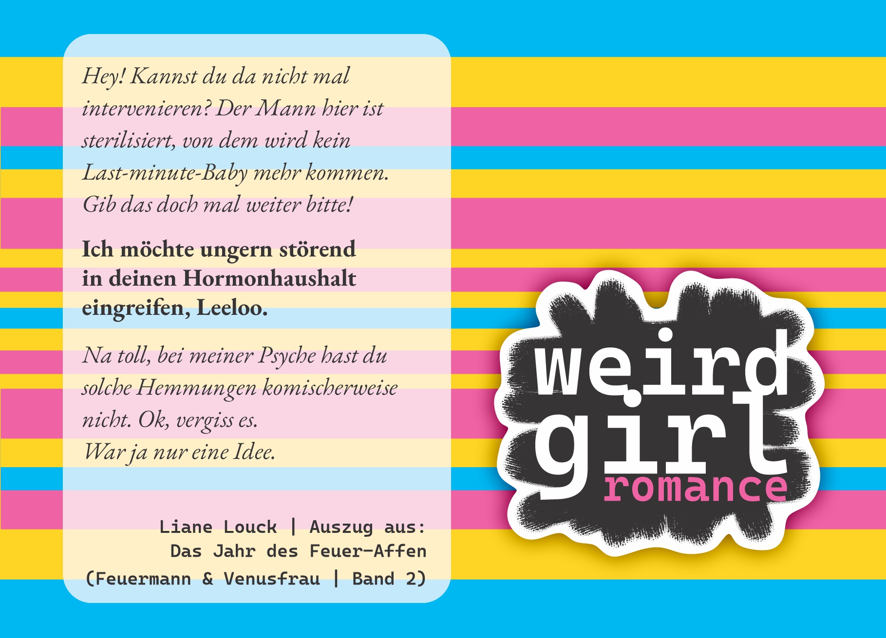 Doch der romantische Chat-Lover wirkt in der Realität plötzlich genauso stachelig wie sein Dreitagebart. Obwohl sie sein Horoskop ausreichend genug studiert hat, um den Grund zu kennen, behält Leeloo eisern die rosarote Brille auf der Nase. Denn was soll schon schiefgehen – im Jahr des Feuer-Affen? „Na ja, einfach alles“, befürchtet ihr sarkastisches Gewissen.